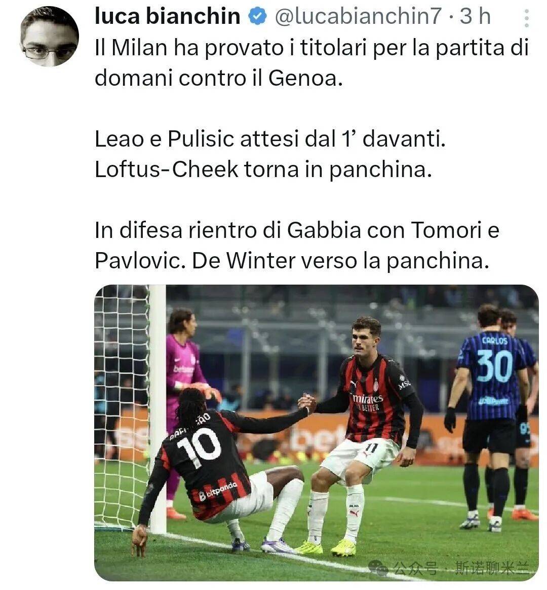 莱昂和普利西奇目前合作的时间很少。如果一切顺利,尽管还没完全恢复健康,他们应该明天同时首发。莱奥需要像在卡利亚里那样专注于进球,他只能继续进步,因为他已经缺席了多场比赛