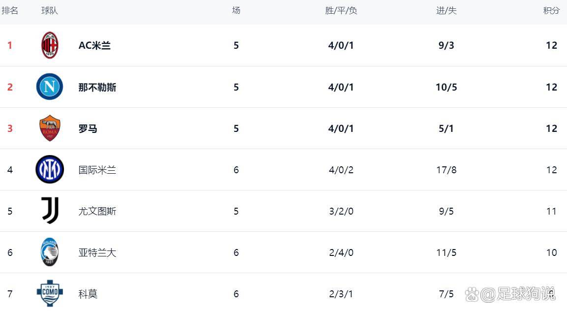 凭借这场大胜,国际米兰以12分的积分强势登顶积分榜首位。尽管AC米兰、那不勒斯和罗马也同积12分,但因净胜球的劣势只能紧随其后,分列第二到第四位,而且这三支球队还少赛一轮,未来的竞争形势依然充满悬念。尤文图斯以11分排名第五,亚特兰大则以10分位居第六。科莫、萨索洛和克雷莫内塞同积9分,而拉齐奥则仅仅拿到7分,排名第十,距离理想目标还有不小的差距。 意甲联赛的竞争格局瞬息万变,各支球队都在为更高的目标而努力拼搏,未来的比赛必将更加精彩纷呈。