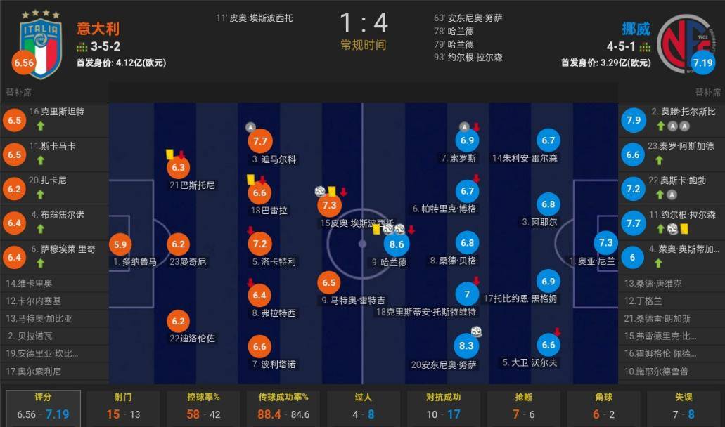 上半场,埃斯波西托头球打破场上僵局,意大利半场1-0领先;下半场,比赛60分钟之后挪威火力全开,瑟尔洛特助攻努萨爆射扳平比分,哈兰德2分钟2球,鲍勃和托尔斯比送助攻,拉尔森破门锁定胜局,托尔斯完成助攻双响。