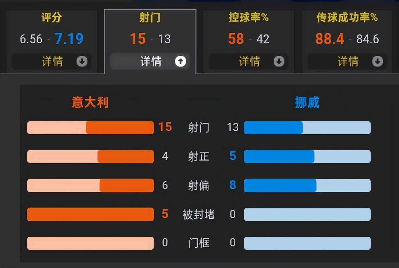 全场比赛,意大利的控球率为58%,一共有15次射门,其中4次射正;而挪威是13次射门,其中5次射正,打入了4球,效率极高。返回搜狐,查看更多