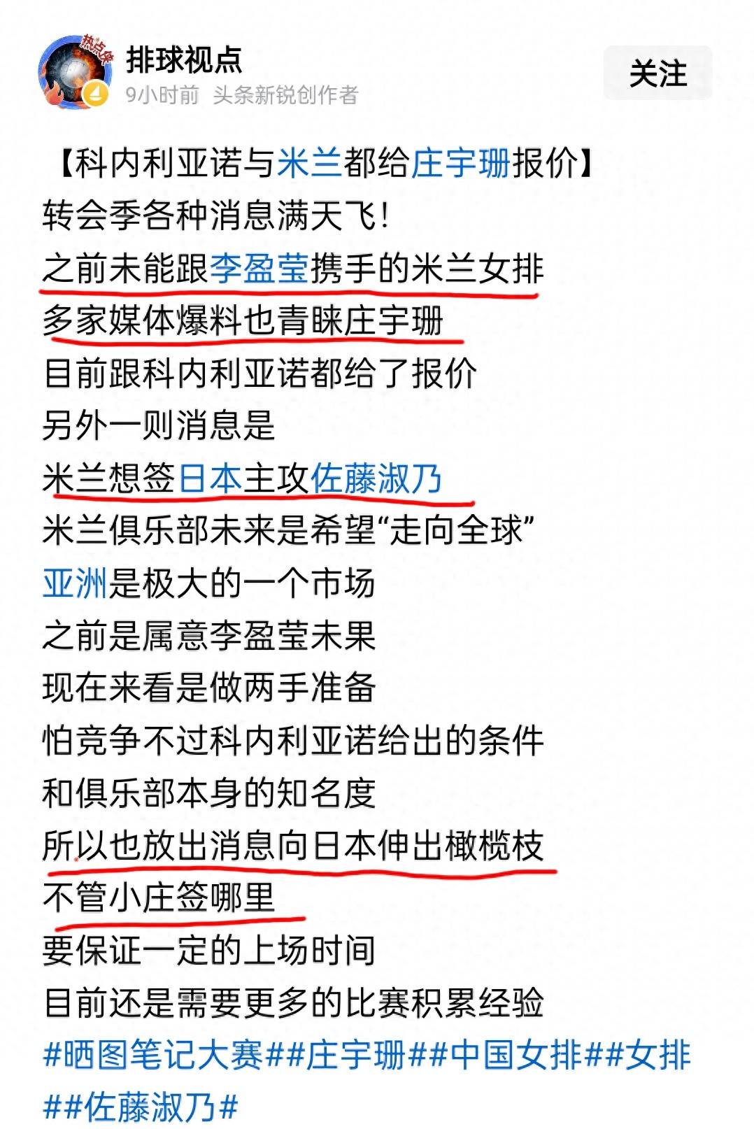 意甲直播,意甲赛程,意甲积分榜,尤文图斯直播,意甲比分预测/面向中文球迷的意甲资讯平台,涵盖2025赛季完整赛程、免费高清直播入口、积分榜更新与竞彩波胆预测,聚焦尤文、国米、米兰三大豪门赛事。据头条新锐创作者“排球视点”等多位头条自媒体创作者消息,下一赛季米兰队欲签下中国籍主攻庄宇珊和日本籍主攻佐藤淑乃;科内利亚诺也给庄宇珊抛出了橄榄枝,科内利亚诺已经“给庄宇珊报价”了。目前,朱婷的经纪人马可在个人社交媒体平台爆出与庄宇珊合影的照片,是不是意味着马可已经在推动庄宇珊加盟科内利亚诺呢?