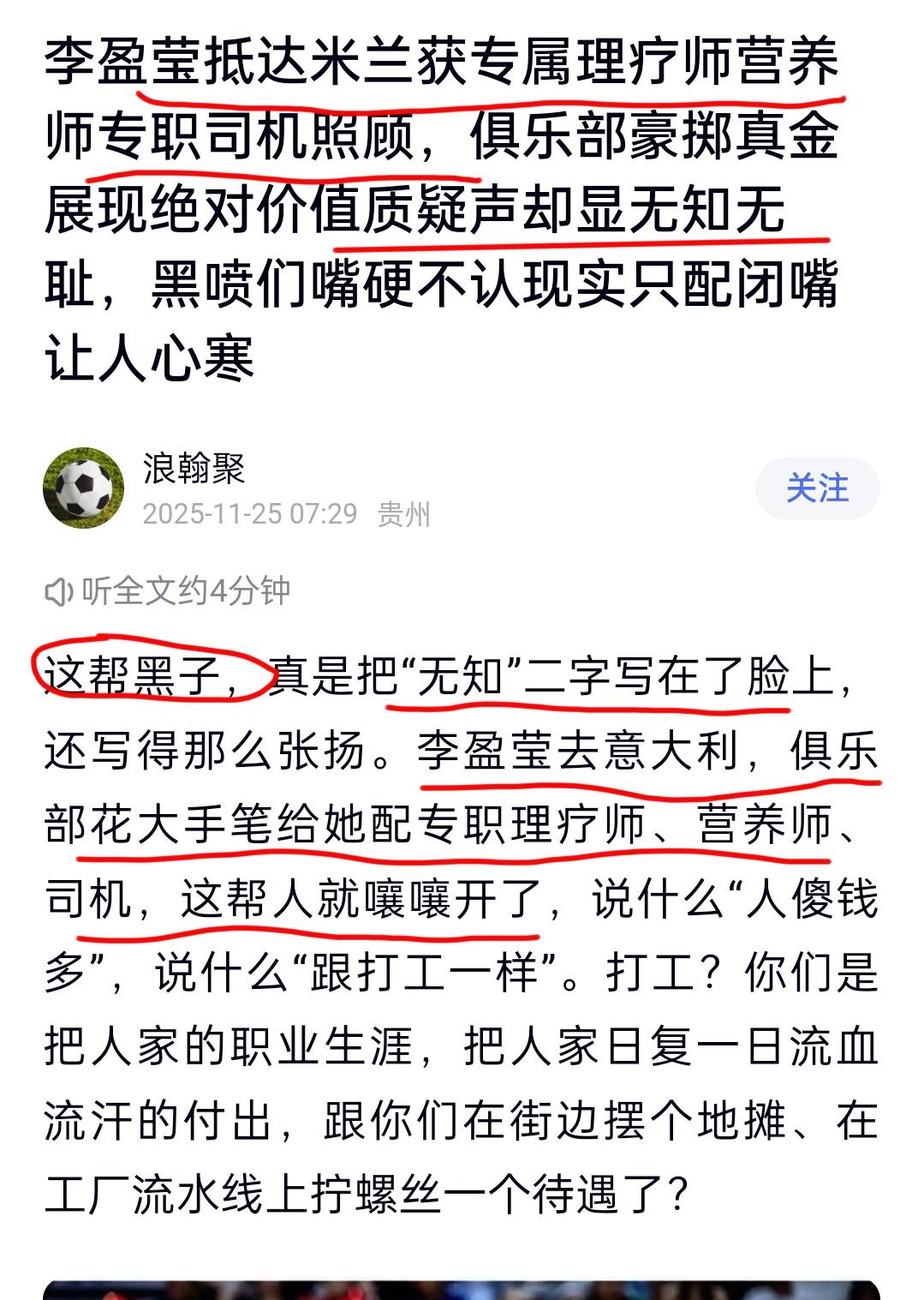 第二、给李盈莹配专职理疗师营养师、翻译、专车,志愿者司机、8℃的冰袋。津粉莹粉放出这样的谣言,是给米兰队加压力,还是津粉莹粉要求米兰队对于李盈莹必特殊对待?米兰俱乐部是妥妥的商业俱乐部,你能给他们创造多大的剩余价值,他们自然就会给你相应的待遇,“双向选择”。