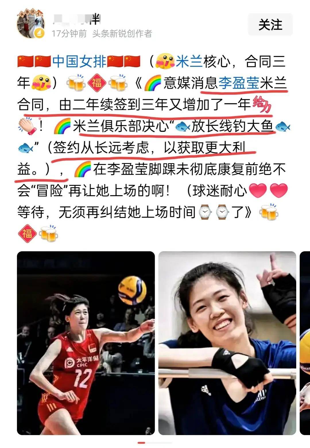 值得一提的是,国家队的另一名队员,也是天津女排的前队长李盈莹因身体原因被米兰队拒签,本赛季无球可打。但笔者相信,李盈莹经过这一赛季的治疗、康复,下一赛季彻底康复完全没有问题。如果李盈莹仍然想实现“米兰见”,建议天津排管中心主任张帆尽快与米兰俱乐部负责人联系,或者找一家靠谱的经纪公司与米兰俱乐部接洽(上次那家经纪公司就算了),让李盈莹早点排队,切记再次重蹈覆辙“受骗上当”。