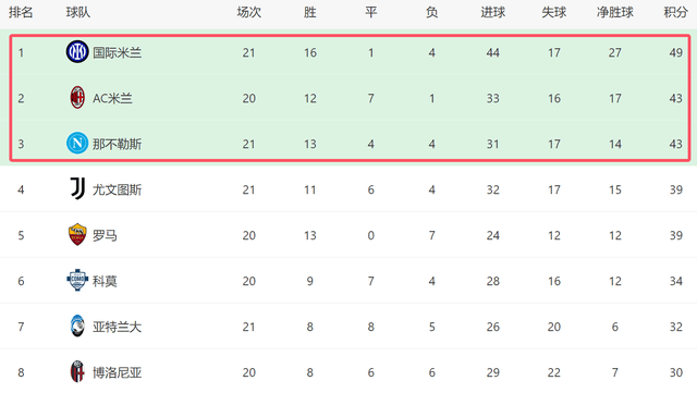 虽然尤文争冠基本出局,但是依然还有2个对手能威胁国米,他们分别是AC米兰和那不勒斯。本轮比赛,AC米兰将在主场迎战莱切,如果能战胜对手,他们和国米的差距就将缩小到3分,再加上AC米兰无需分心欧战,下半赛季的体能优势,随时会帮助AC米兰逆袭。